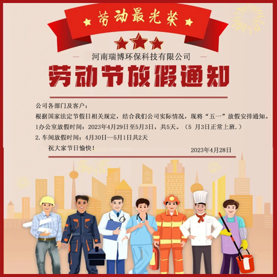 您好!五一勞動(dòng)節(jié)即將到來,在這個(gè)充滿喜慶與歡樂的日子里,瑞博環(huán)保全體員工向您和您的家人致以美好的祝福和問候!